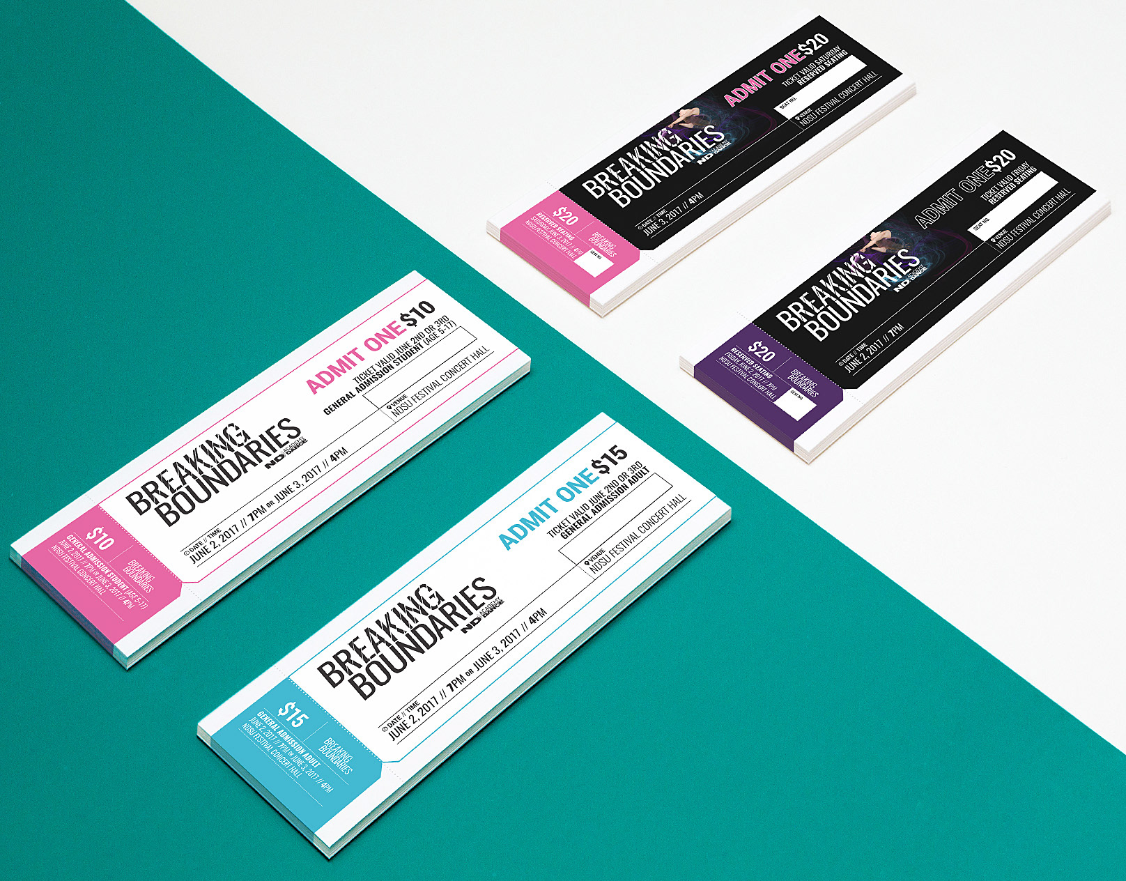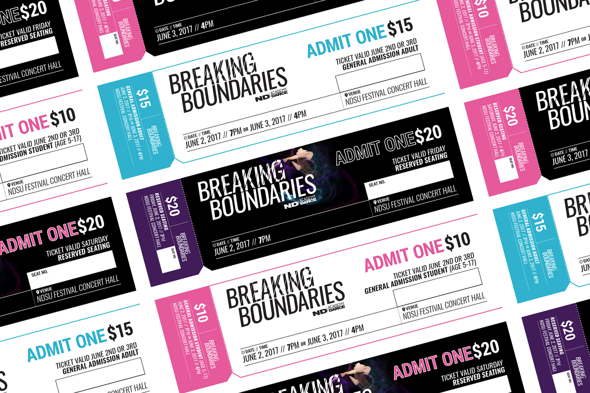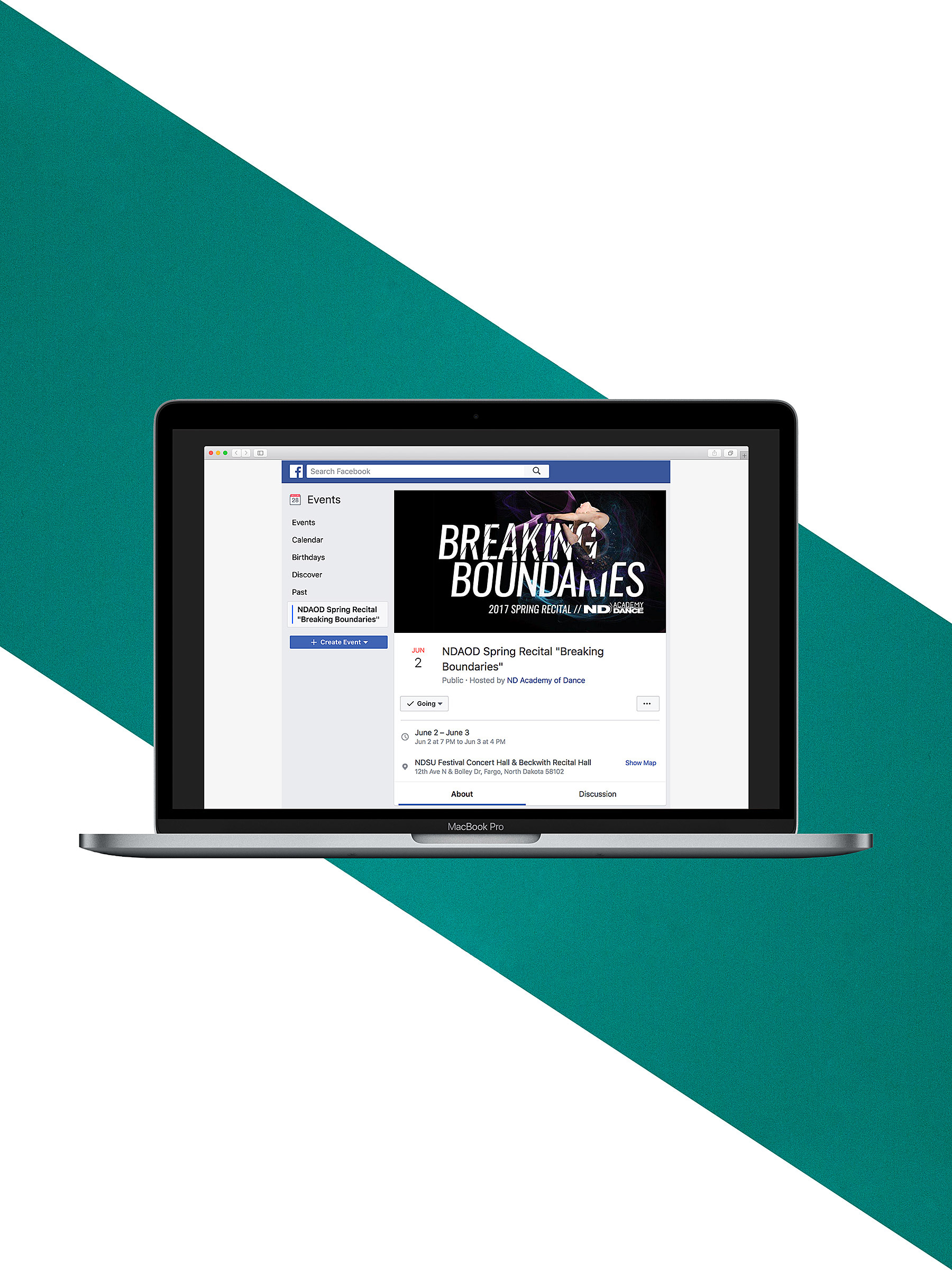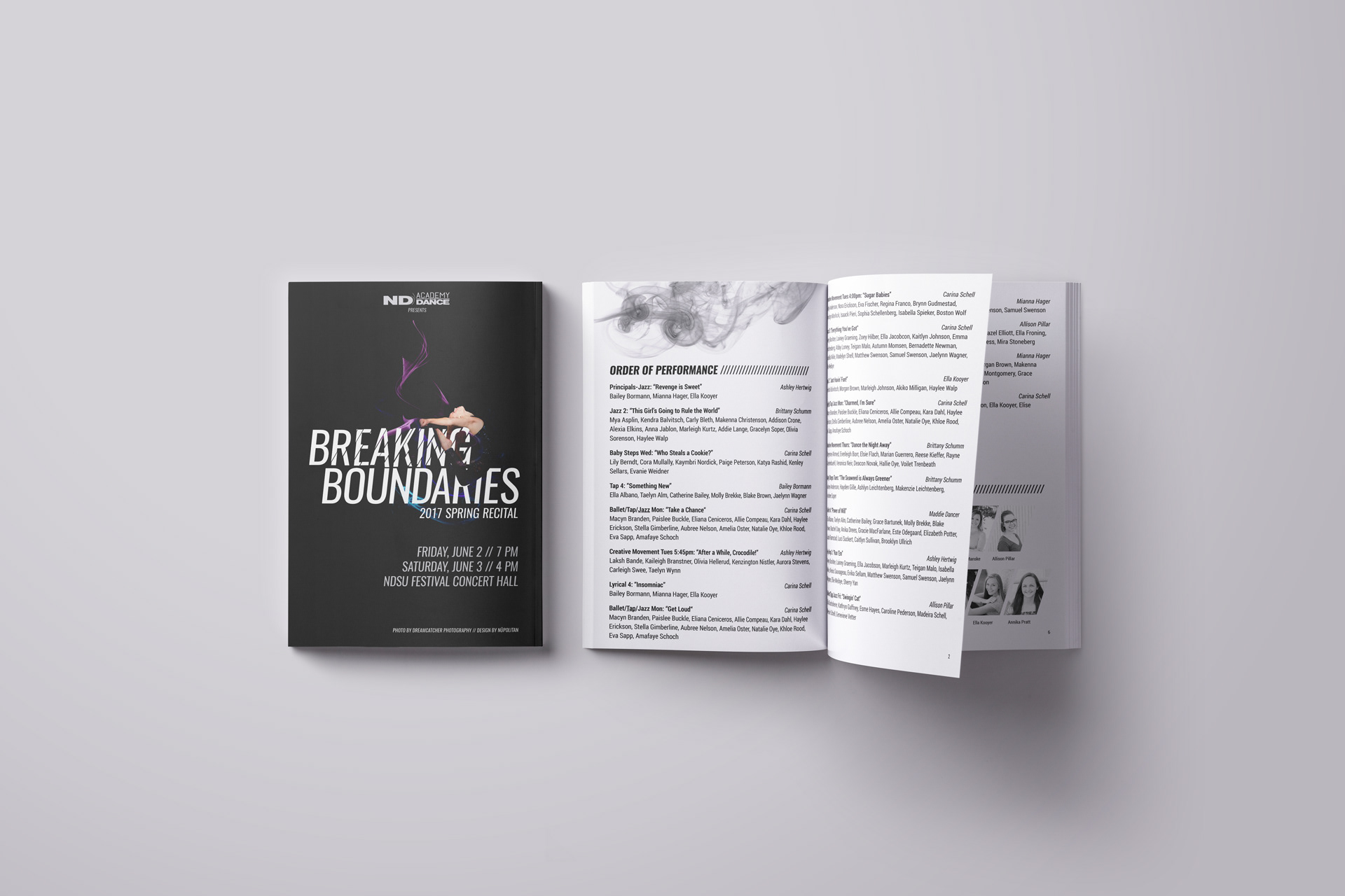 North Dakota Academy of Dance's spring recital, titled Breaking Boundaries, featured performances by students ages 2-18 from each class offered over the course of the season. Provided with a photo from Dreamcatcher Photography, we designed a set of collateral involving 11x17 flyers, tickets for the production, social media graphics, a printed program, a t-shirt design, and a video that was projected as an accompaniment to one of the ballet performances.