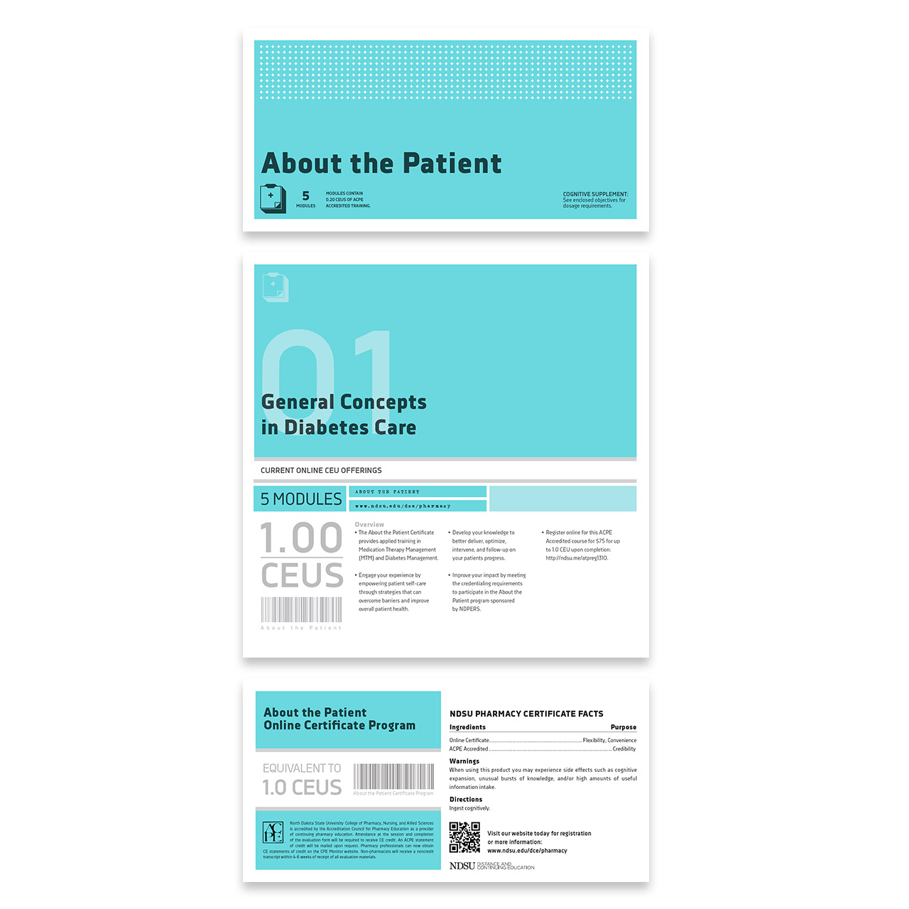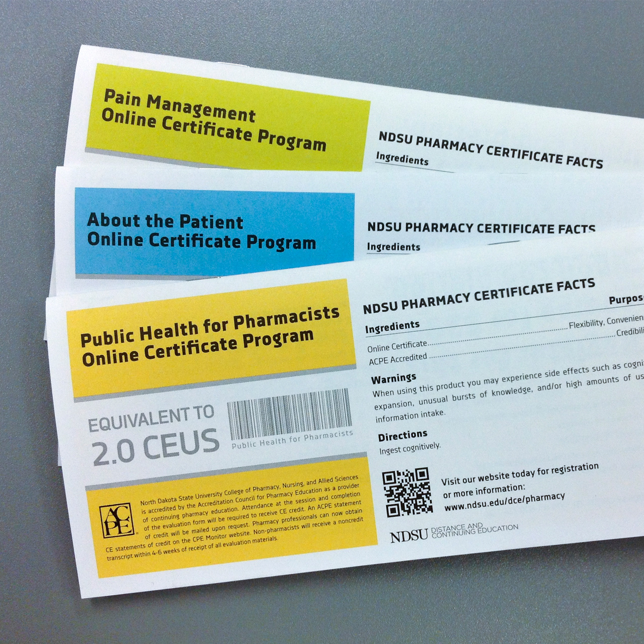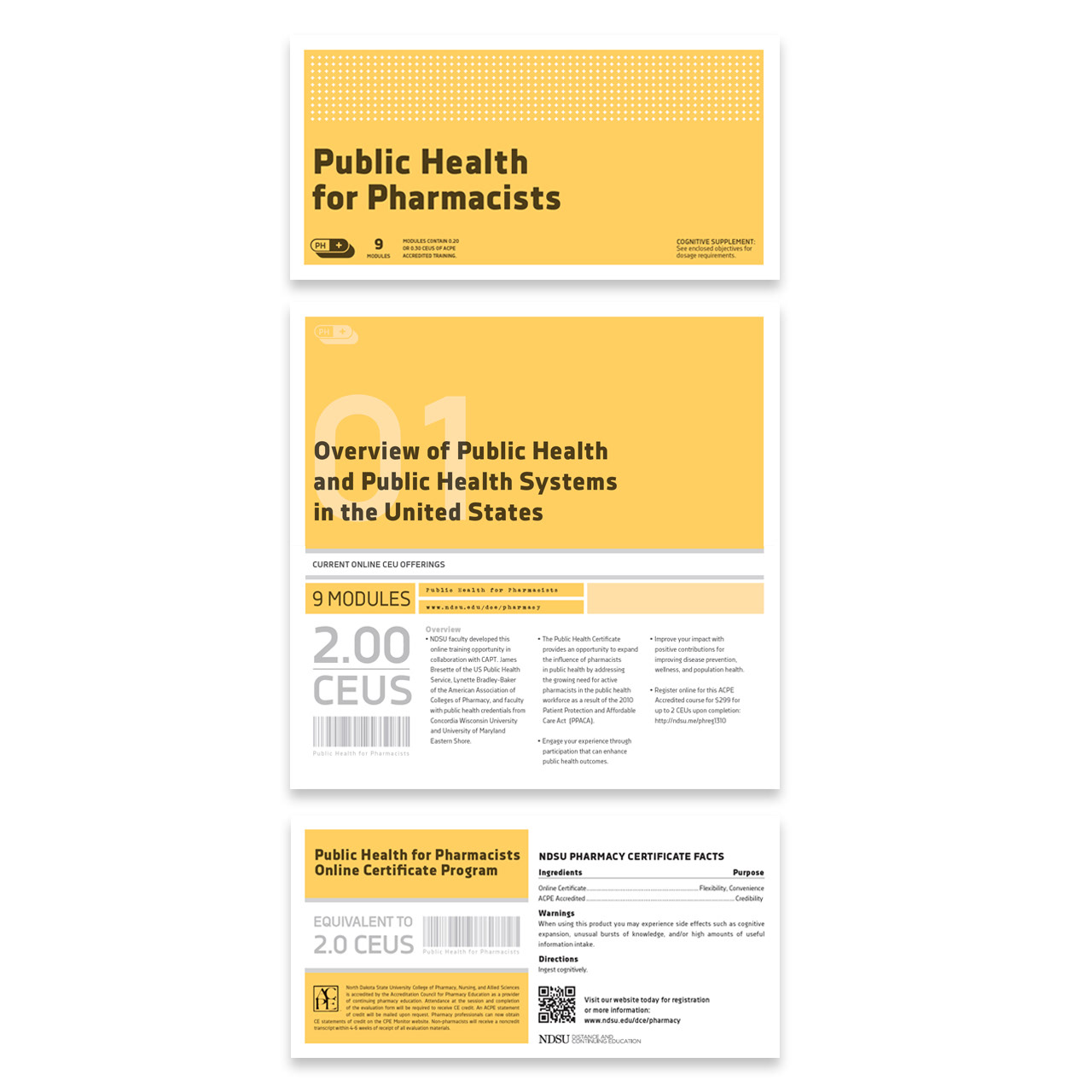 The NDSU Pharmacy program, in conjunction with Distance & Continuing Education, launched a new program called Public Health to offer continuing education units. Utlizing a small budget, we were challenged to promote the new course along with two existing courses. I collaborated with Ludvik Herrera and a group of fantastic interns from two local institutions: Mikky Daub, Corey Gillerstein, and Jared Froeber.