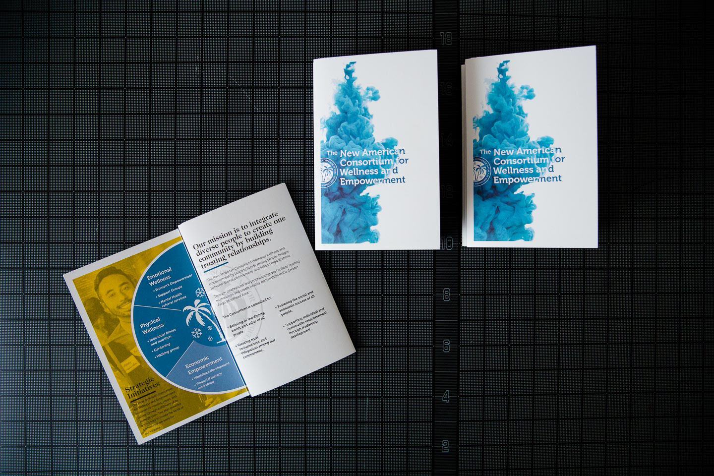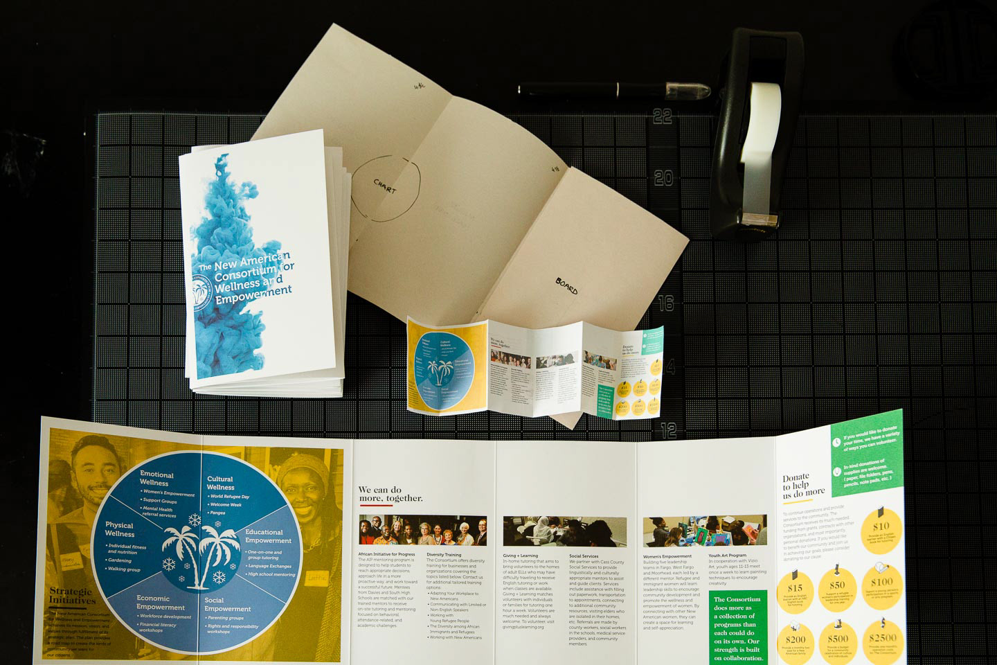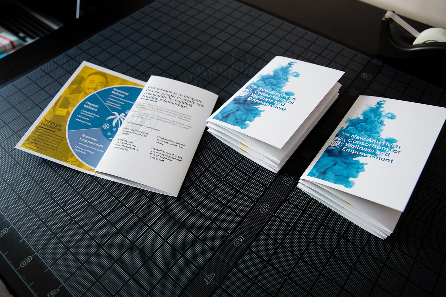 The New American Consortium for Wellness and Empowerment needed a way to share the work of their organizations and allow potential donors the opportunity to give. Instead of the traditional tri-fold brochure, we designed an informational packet of mailable size to provide a more substantial in-hand experience. The packet incorporates photos from the group’s events and social media accounts while giving an overview of the activities and goals of the organizations that comprise the Consortium.