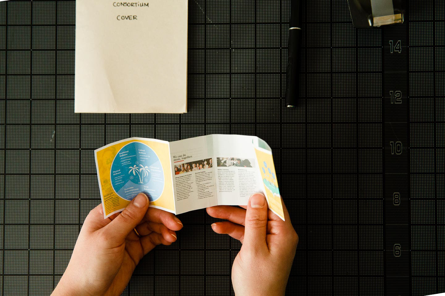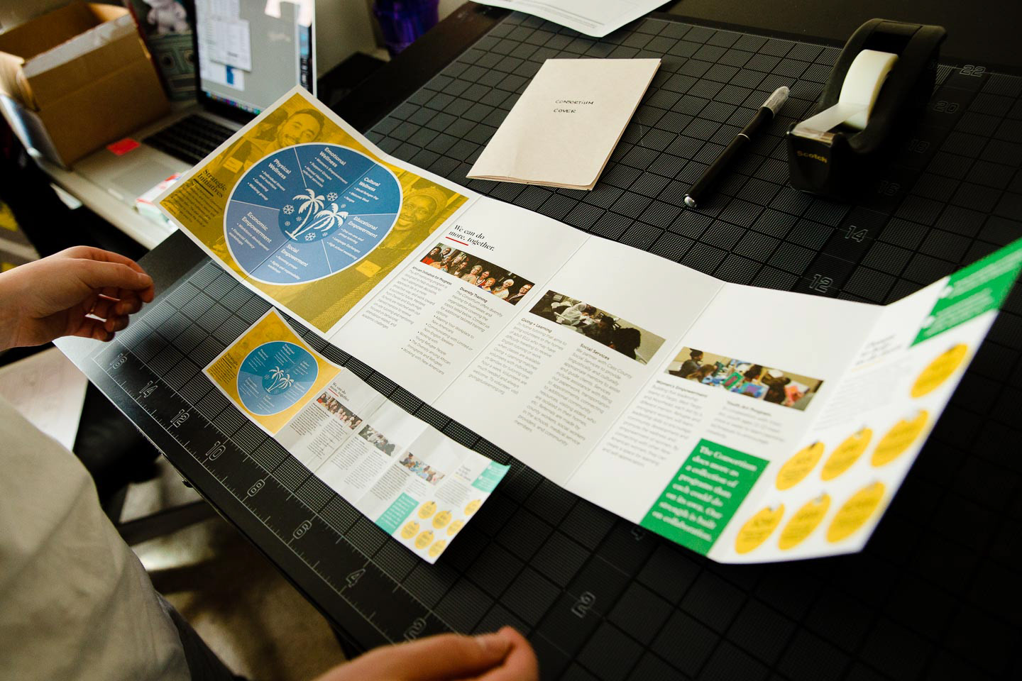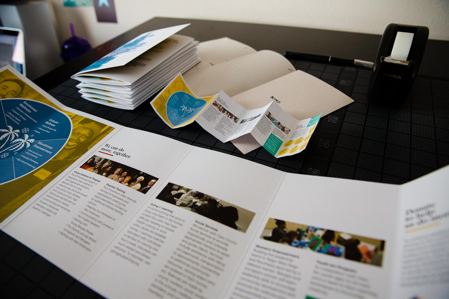 The New American Consortium for Wellness and Empowerment needed a way to share the work of their organizations and allow potential donors the opportunity to give. Instead of the traditional tri-fold brochure, we designed an informational packet of mailable size to provide a more substantial in-hand experience. The packet incorporates photos from the group’s events and social media accounts while giving an overview of the activities and goals of the organizations that comprise the Consortium.